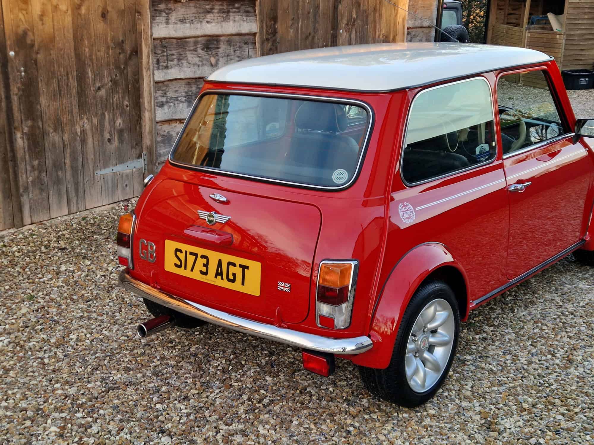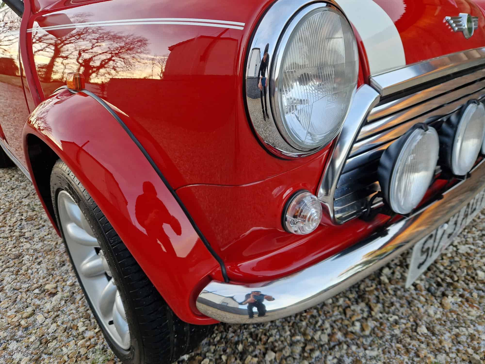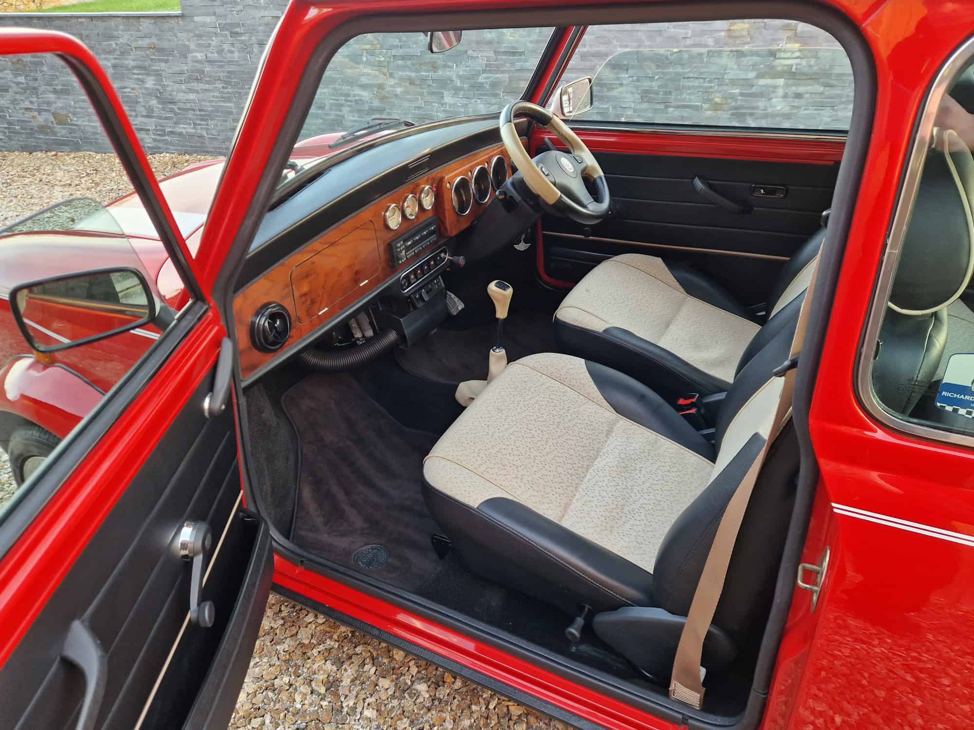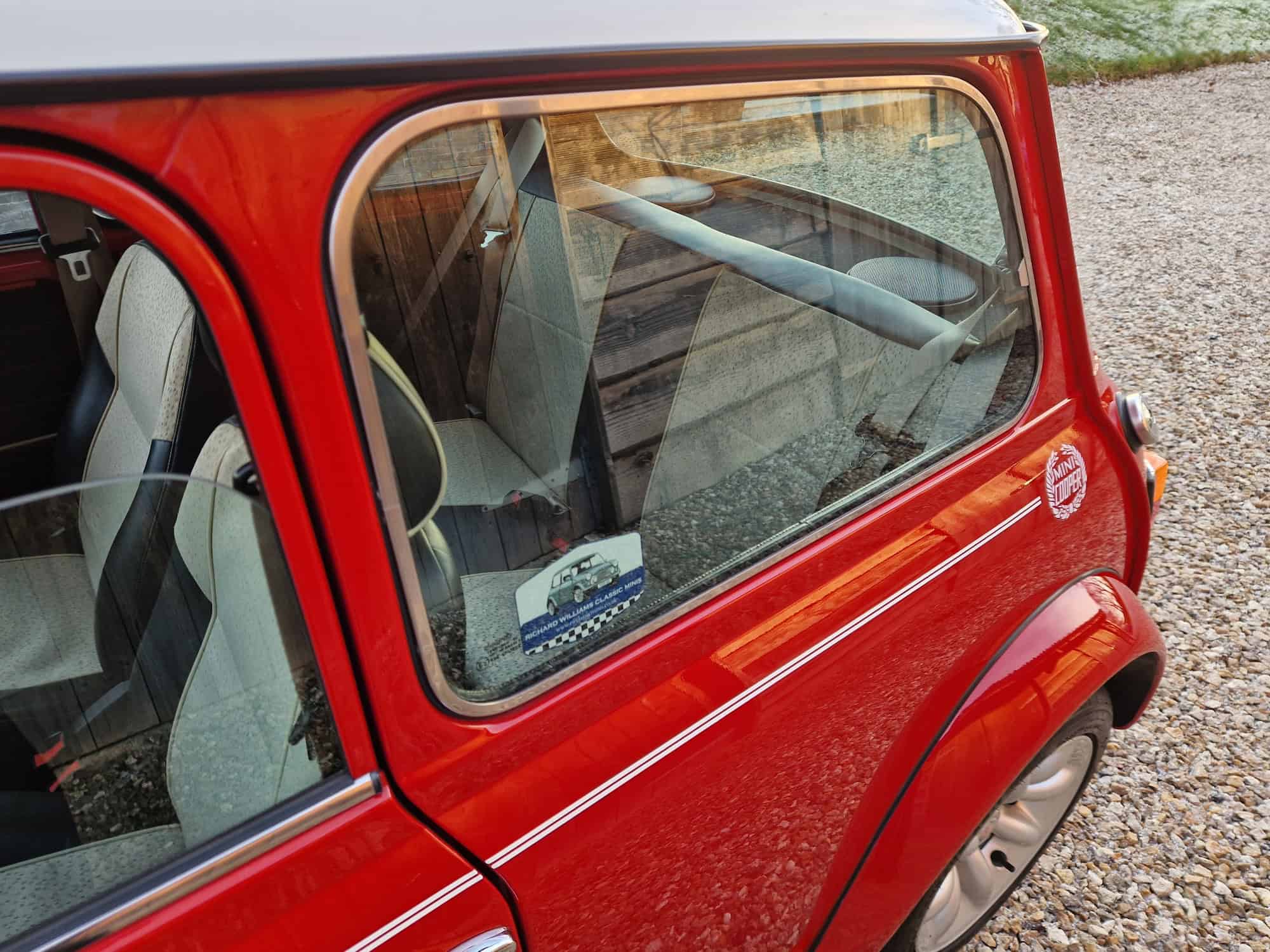 1998 Rover Mini Cooper Sport in classic Flame Red with a white roof, bonnet stripes and mirrors. This outstanding Mini has covered just 9475 miles from new and is very original. I sold the mini 15 years ago when it was on 8400 miles and it has been dry stored and very well cared for. It is very rare to see examples as clean and original. The interior is also in lovely condition with its original factory walnut dashboard and Rover CD Radio. As you would expect it drives very well and feels close to a new Mini Cooper. This is a rare opportunity and will make an exciting Mini Cooper to own, drive and polish. Free delivery to your door in my curtain sided van within 200 miles of Tiverton.